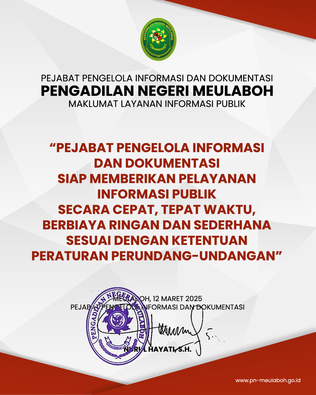 Ketua Mahkamah Agung RI pada tanggal 30 Agustus 2022 telah menerbitkan Surat Keputusan Ketua Mahkamah Agung RI Nomor 2-144/KMA/SK/VIII/2022 tentang Standar Pelayanan Informasi Publik di Pengadilan.