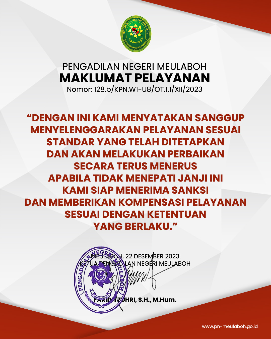Ketua Mahkamah Agung RI pada tanggal 30 Agustus 2022 telah menerbitkan Surat Keputusan Ketua Mahkamah Agung RI Nomor 2-144/KMA/SK/VIII/2022 tentang Standar Pelayanan Informasi Publik di Pengadilan.